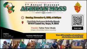Seventh Annual Diocesan African Mass The African Catholics Ministry invites all to the Seventh Annual Diocesan African Mass, to be celebrated on November 9, 2025 at 2:00pm at Most Holy Redeemer Catholic Church, 10110 N. Central Ave, Tampa, FL 33612. Come and experience the celebration of the Eucharist with diverse African languages and cultures. A …