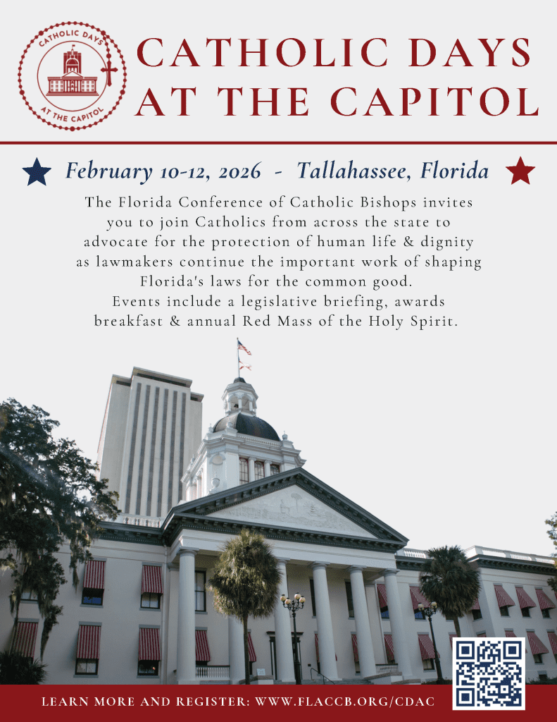 Florida’s Bishops invite you to join them in Tallahassee to advocate for the protection of human life and dignity as lawmakers continue the important work of shaping Florida’s laws and future for the common good. Each year during the legislative session, Catholic from across the state gather in Florida’s capital city to put their faith and civic responsibility into action.