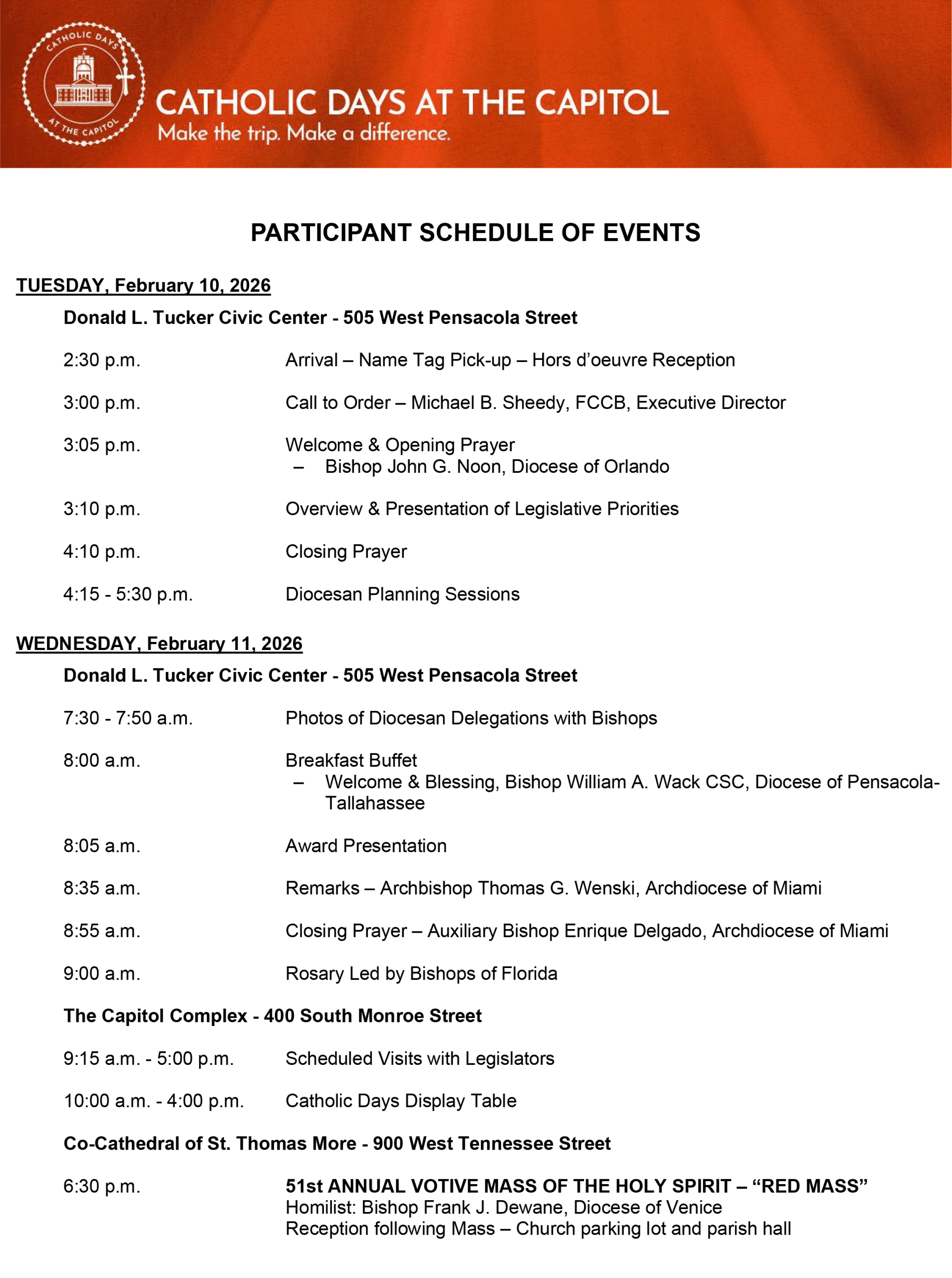 In addition to the legislative events, the 51st Annual Red Mass of the Holy Spirit will be concelebrated by the bishops of Florida to pray for those working in the legislative, judicial, and executive branches of government on the evening of February 11.