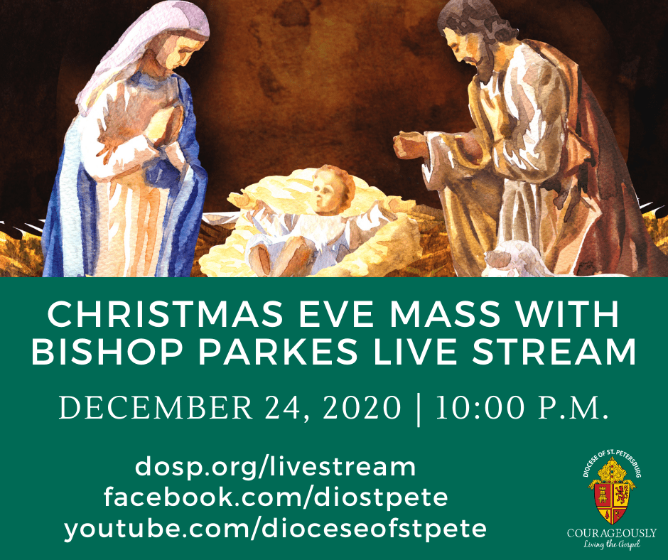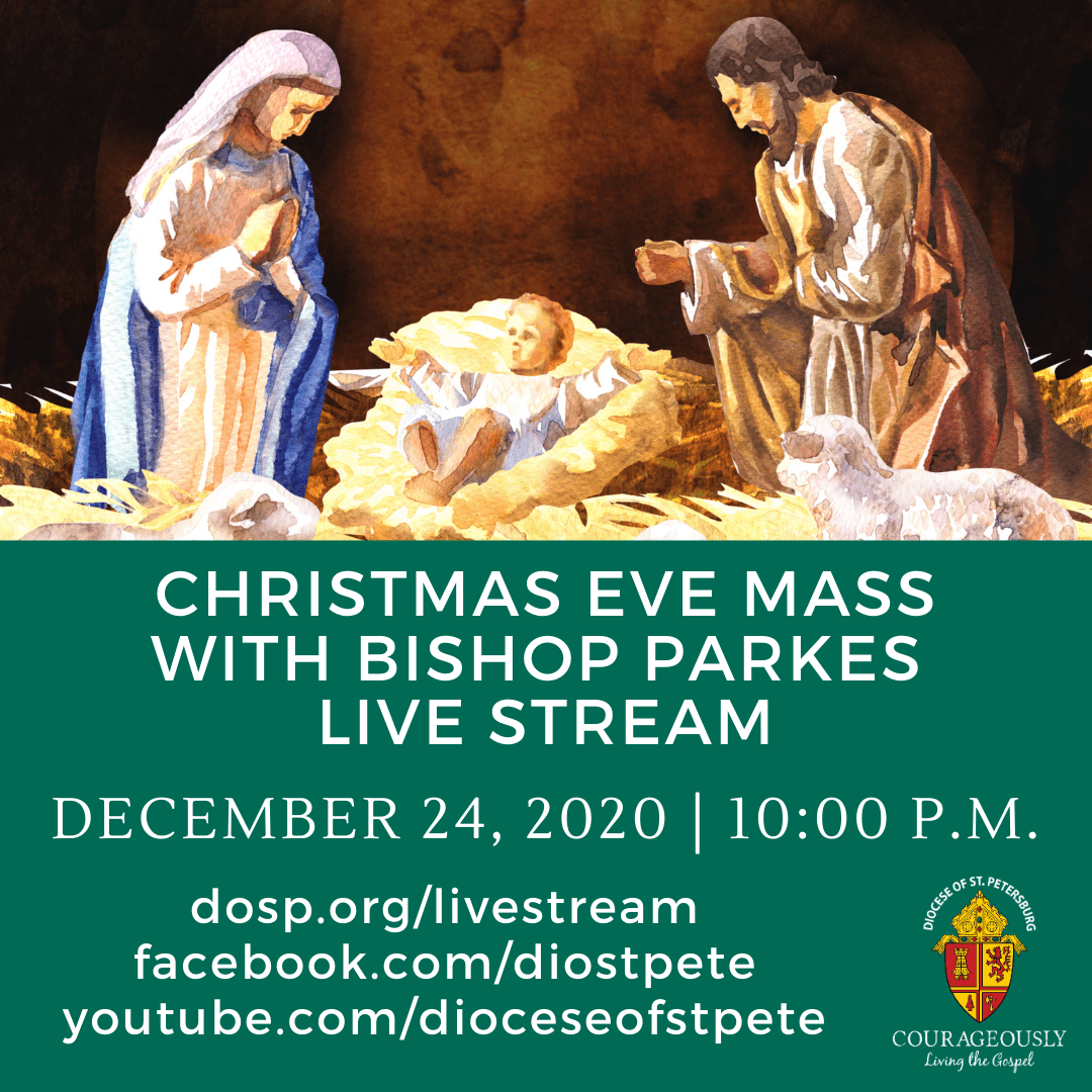 Those who are unable to attend in person are invited to celebrate Christmas Eve Mass with Bishop Gregory Parkes via livestream from the Cathedral of St. Jude the Apostle at 10:00 p.m. on Thursday, December 24th. All are invited to pray along virtually online at www.dosp.org/livestream, www.facebook.com/DioStPete and www.YouTube.com/DioceseofStPete or listen to Spirit FM 90.5 at midnight for a broadcast presentation.