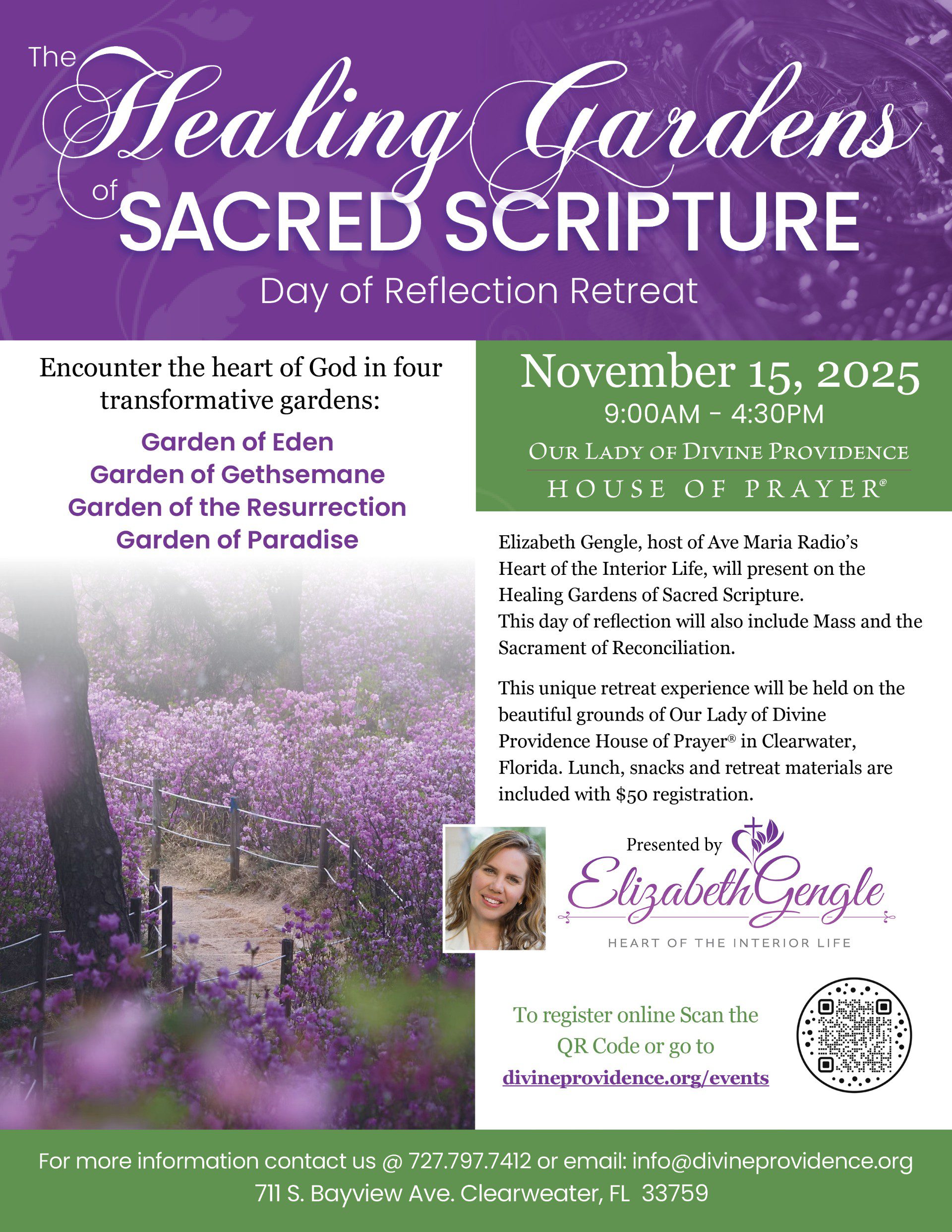 The Marian Servants of Divine Providence are sponsoring the Healing Gardens of Sacred Scripture Day of Reflection with Elizabeth Gengle, host of Ave Maria Radio’s Heart of the Interior Life. The retreat day will be held at Our Lady of Divine Providence House of Prayer®, 711 S. Bayview, in Clearwater, on November 15, 2025.