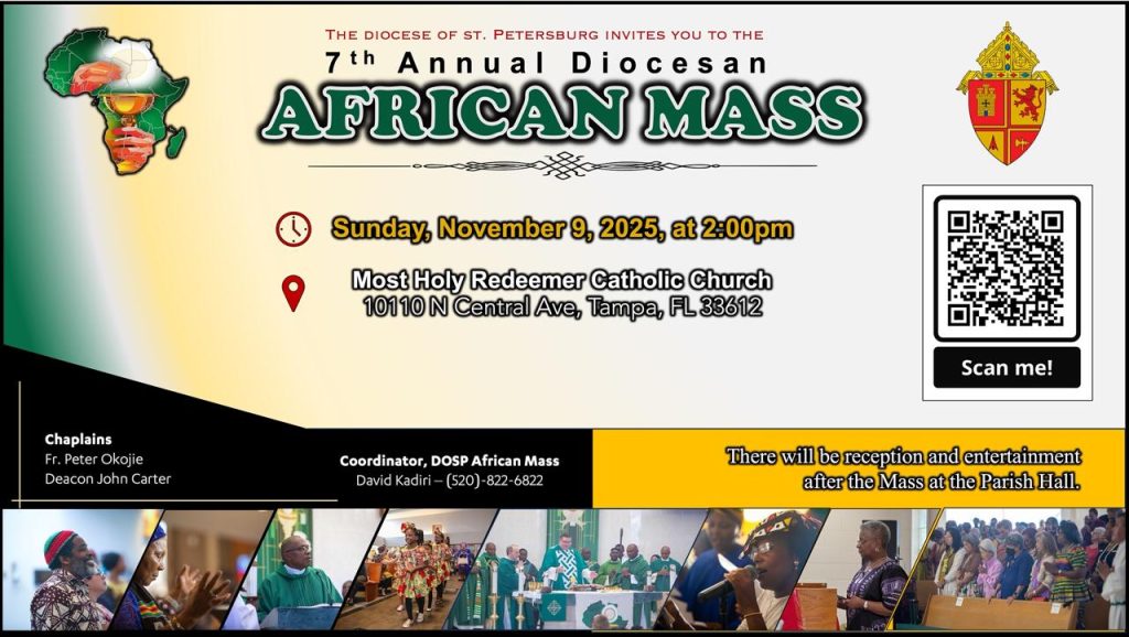 The African Catholics Ministry invites all to the Seventh Annual Diocesan African Mass, to be celebrated on November 9, 2025 at 2:00pm at Most Holy Redeemer Catholic Church, 10110 N. Central Ave, Tampa, FL 33612. Come and experience the celebration of the Eucharist with diverse African languages and cultures. A reception will follow the Mass with samples of African food.